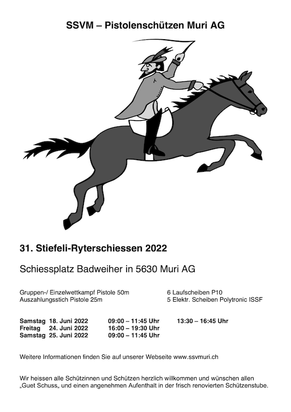 Dieses Jahr führen wir das 32. Stiefeliryterschiessen durch. Wir freuen uns auf zahlreiche Schützinnen & Schützen!